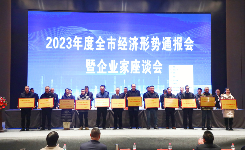 市政府党组成员、副市长赵曜宣读《市工业经济工作领导小组关于表扬2023年度国家、省专精特新企业、稳增长贡献突出企业、经济贡献突出企业的通报》。
