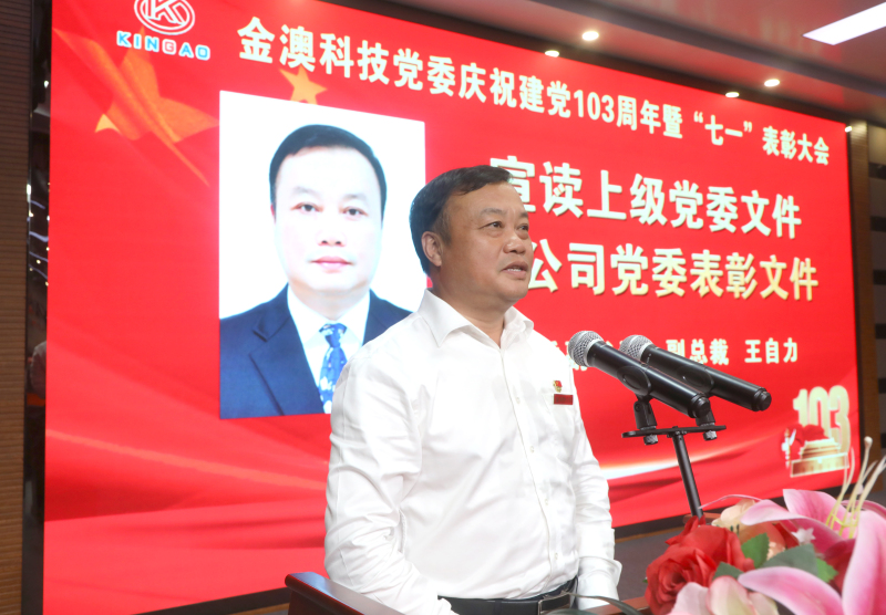 6月28日晚,金澳集团在多功能厅隆重召开庆祝中国共产党成立103周年暨“七一”表彰大会。金澳集团执行总裁吴让生,金澳科技党委书记、轮值总裁肖生强,党委副书记、副总裁王自力等在家高管、各党支部党员、入党积极分子,部分副科级及以上管理干部参加。